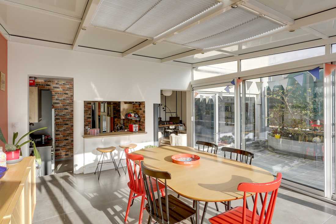Pour répondre à ce besoin, l’architecte d’intérieur a créé une grande verrière sur mesure qui permet de marquer cette délimitation tout en conservant la vision globale de l'espace d'origine et son caractère traversant.